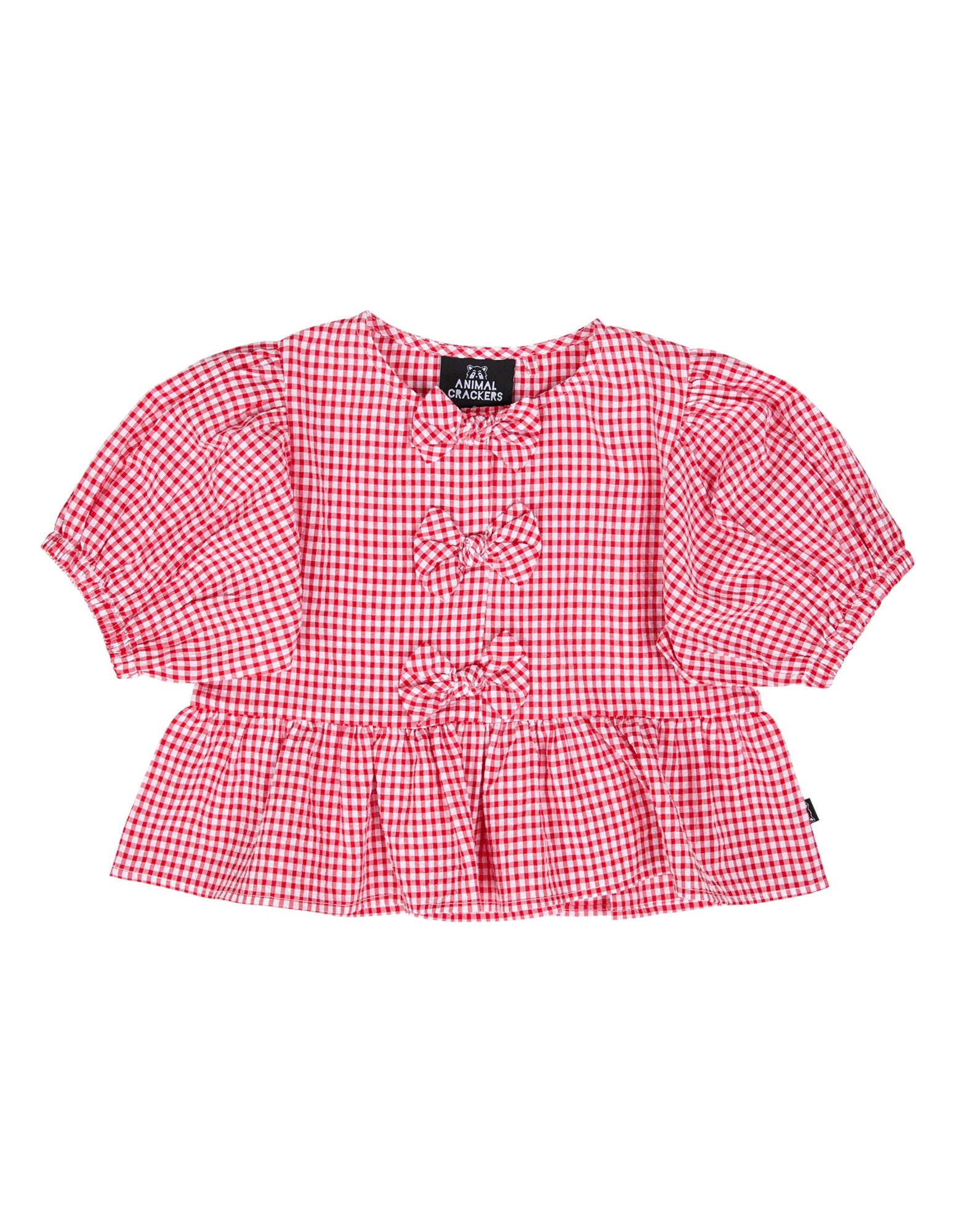 Sweet peplum top in red and white gingham to go matchy matchy with the Checkered Short or pop back with her cutest denim.
